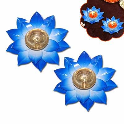 Fancy Lotus Brass Diyas (Set of 2) (Blue color)-002 |