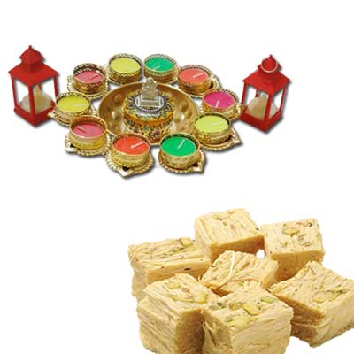 Fancy Lotus Brass Diyas (Set of 2)(Blue),500gms of Laddu |