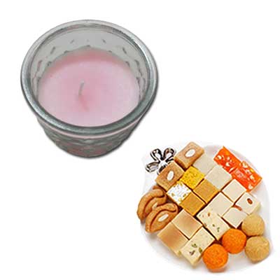 Cute scented Candle with lid, 500gms of Assorted sweet |