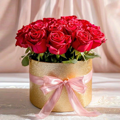 Flower Box with 20 Red Roses along with fillers tied with Ribbon