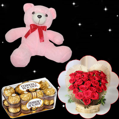 Pink colour Teddy BST-13008-002 Height: 30cm + Ferrero Rocher 16 pieces Chocolates + Beautiful Heart shape flower arrangement with 25 Red Roses. Note: Same day Delivery for Hyderabad and Secunderabad. For other places requires minimum 3 to 4 WORKING DAYS