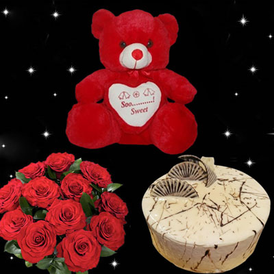 Red Colour Teddy BST-13004-001 Height: 30cm + Delicious designer pineapple cake - 1kg + 12 Red Roses Flower bunch Note: Same day Delivery for Hyderabad and Secunderabad. For other places requires minimum 3 to 4 WORKING DAYS