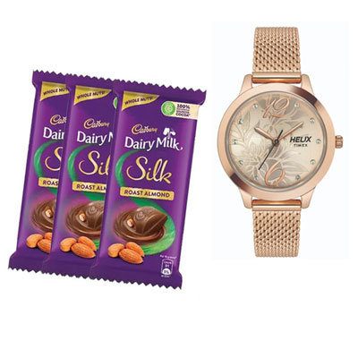 Timex Ladies Watch - TW022HL17 + Cadbury Dairy Milk Silk Roast Almond - (3 Pieces) Each Chocolate wt. 52gms Note: Same day Delivery for Hyderabad and Secunderabad. For other places requires minimum 3 to 4 WORKING DAYS