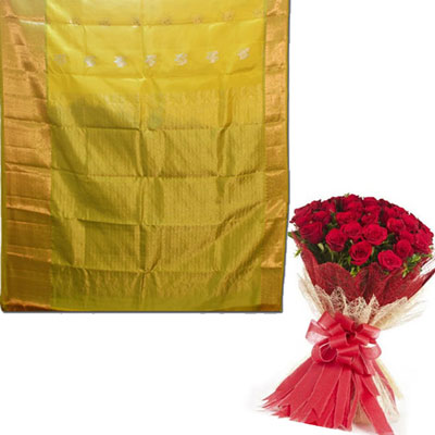 Kalaneta green colour Kanchi saree DSEM- 20 + Beautiful Flower Bunch with 25 Red Roses with decorative paper wrapped. Note: Same day Delivery for Hyderabad and Secunderabad. For other places requires minimum 3 to 4 WORKING DAYS