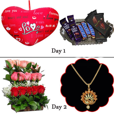 Day 1 : Heart shape pillow - BST 13107 (Soft toy) Size :24cm * 15cm + Cadbury's Bournville Rich coco chocolates -3bars + Snickers chocolates -3 bars + Dairy Milk Chocolates -3 bars + Tray Day 2 : Beautiful flower basket with 5 Red, 5 Pink and 5 Orange Roses along with Fillers + Fancy chain with Pendant - code MGR 923 Note: please mention the starting day date as Delivery date of serenade gift hamper in shipping instructions.