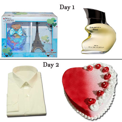 Day 1 : Valentine Decorative with Message Bottle N Lighting - 1239 Size :16 cm*13 cm + Rasasi - Chastity men perfume Day 2 : Pure Cotton Shirt - BR-20010-005, Size: 42 + Heart shape designer Red velvet Cake - 1kg Note: please mention the starting day date as Delivery date of serenade gift hamper in shipping instructions.