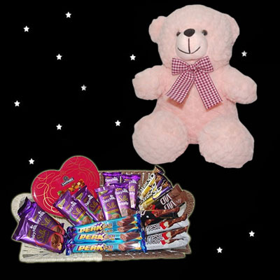 Pink Colour Teddy BST-13005-001 Height: 25cm + Heart shape sapphire fruit and nut chocolate box + Dairy milk silk Roasted almond chocolates - 3bars + Dairy milk silk Bubbly chocolates - 3 bars + 5star 3D chocolates - 3 bars + VIP chocolates - 3 bars + Go fresh chocolates - 3 bars + Perk chocolates - 5 bars + Dairy milk silk fruit and nut chocolates - 3 bars + Big size thread basket