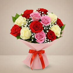 Fresh and Lovely Rose Bouquet with 12 Mixed Roses along with fillers wrapped in a decorative paper and tied with Ribbon.