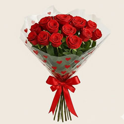 Beautiful Flower Bouquet with 15 Red Roses wrapped in a decorative paper with bow.