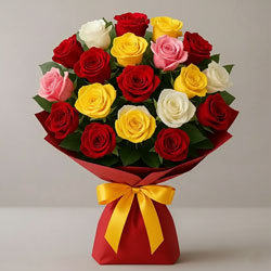 Fresh and Lovely 24 Mixed Roses Bouquet wrapped in a decorative paper and tied with Ribbon.