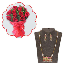 Raksha 1 Line Round Pearl Necklaces - JPFEB-22-220 + Beautiful Flower Bunch with 10 Red roses wrapped with decorated pap...