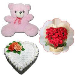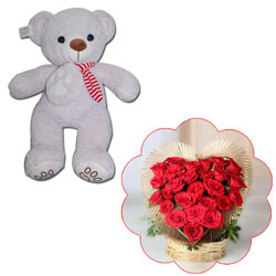 Beautiful Heart shape flower arrangement with 25 Red Roses + Teddy Bear Cream BST- 9108-001 Height:50 cm NOTE: Same da...