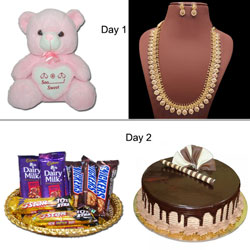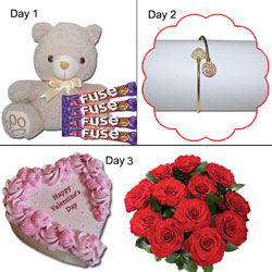 Multi Day Hamper Day 1: Valentine Teddies BST 10237- Size 28cm*17cm Day 2: 25 Red Roses flower bunch wrapped in ...