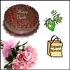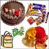 Delicious yummy chocolate cake -1kg + 12 pink roses flower bunch + Ugadi Hamper (1 Big Green Mango, Cheruku Mukkalu, Vaepa P...