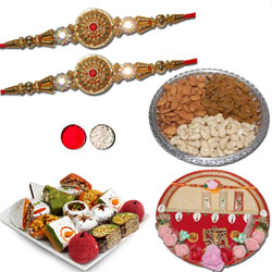 Designer Fancy Rakhi - FR- 8370 A - (2 RAKHIS) + 500gms Kaju Assorted Sweets + Rakhi Thali - RT-2310 A + Badam 100 gms+ Kaju...