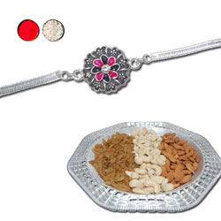 Silver Coated Rakhi - SIL-6190 A (Single Rakhi) +Badam-100 Gms + Kaju -100Gms+ Kismis - 100Gms + Designer Silver colour Tray...