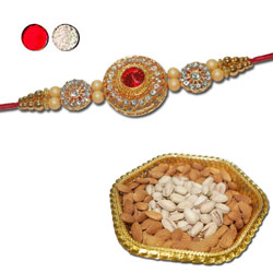 Stone Studded Rakhi - SR-9360 A (Single Rakhi) +Badam -100 Gms+ Pista -100 Gms+ Gold colour Tray. Dryfruit Thali - code RD30...