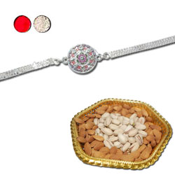 Silver Coated Rakhi - SIL-6210 A (Single Rakhi) +Badam -100 Gms+ Pista -100 Gms+ Gold colour Tray. Dryfruit Thali - code RD3...