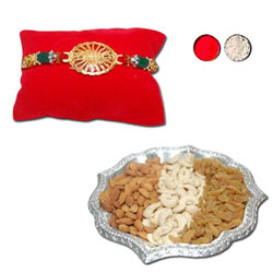 Zardosi Rakhi - ZR-5520 A (Single Rakhi) +Badam 100 gms+ Kaju 100 gms + Kismis 100 gms + Silver color Tray. Dryfruit Thali -...