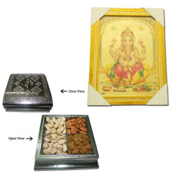 Golden photo Frame Lord Ganesh + Manmeet Dry Fruit Box Kaju + Badam + Kismis + Pista Empty Box weight:200 gms with Dryfr...