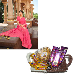Small Teddy Bear + 3 snickers + 3 Cadbury perks + 200gms Tiffany chocolates packed in a fancy pouch + basket + Beautiful par...