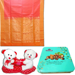 Fancy Silk Saree Seymore Kesaria -11370 + Dairy milk silk chocolates -3 bars + Heart shape kaprika 5 pieces chocolate bo...