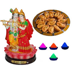 Radha Krishna Idol - code 7 Size : 8 Inches + 500gms of Kova Puri + 4 colors of Gulal Packets