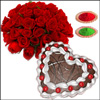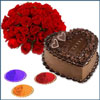 Yummy Delicious Heart shape chocolate cake - 1kg + 15 red roses flower bunch + 3 colors of Gulal Packets.