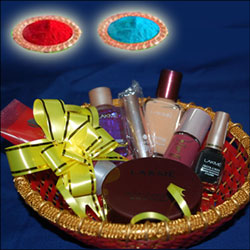Lakme face powder + foundation cream + Nail polish + eye linear + Lipstick + face wash + Nail polish remover + basket + Smal...