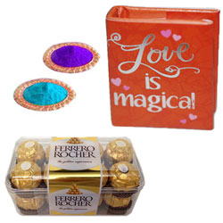 Love is Magical miniature book+ Ferrero Rohcher chocolates - 16pieces box + 2 colors of Gulal packets NOTE: Same day D...
