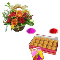 Beautiful Flowers arrangement with 20 mixed roses + Sweet Delicious laddu - 1kg + Gulal Colors - 2no.