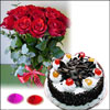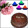 1kg Delicious chocolate cake + 12 pink roses bunch + 4 colors of Gulal packets