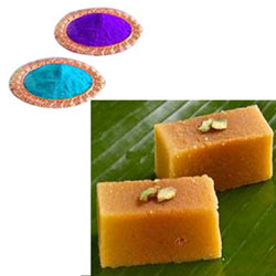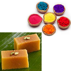 500gms assorted sweets + 6 colors of Gulal packets + free greeting card