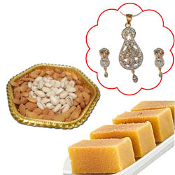 American Diamond Necklace Set - Code No 1034-001 + Badam -100 Gms+ Pista -100 Gms+ Gold colour Tray. Dryfruit Thali - co...