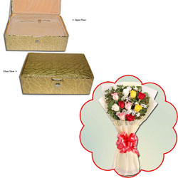 Jewellery Box-Code 3033-code001 Size:13cm*18cm + 10 mixed roses flower bouquet along with fillers wrapped in a 2 layer...