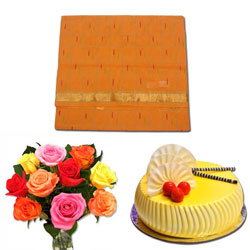 Village Cotton saree - HSNM- 106 (Without Blouse) + Delicious round shape mango cake - 1kg + 12 mixed Roses Flower bunch...