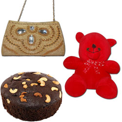 HAND PURSE -11646 Size:20cm*10cm +Teddy Bear BST-9105-001 Height:35 cm + Yummy delicious round shape plum cake - 1kg ...