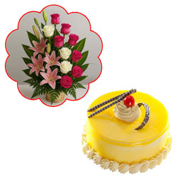 • Name : Pineapple cake - 3kgs, 12 mixed roses flower basket