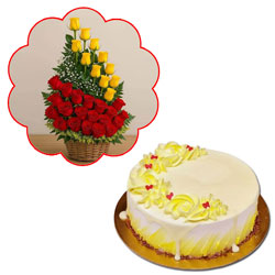 Delicious Round shape pineapple cake - 2kg +Beautiful flower basket with 5 Red, 5 Pink and 5 Orange Roses along with Fil...