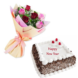 Yummy Delicious square shape black forest cake -1kg + 6 Red and pink Roses flower bouquet along with fillers wrapped in ...