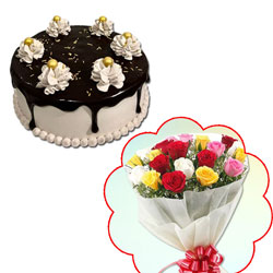 Delicious Round shape Chocolate cake -1kg + Bunch of 10 mixed Roses with fillers wrapped in 2 layers decorative paper al...