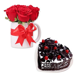 • Name : Heart shape Black Forest flavour cake - 1kg, Mug with Flowers