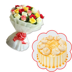 Delicious Round shape Butterscotch cake - 1kg + 21 mixed roses flower bouquet along with fillers wrapped in 2 layers wit...