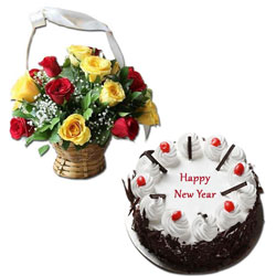 Delicious round shape black forest cake - 1kg + 12 mixed roses flower basket with fillers decorated with ribbon attached.