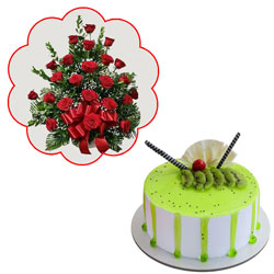 Delicious Round shape Kiwi cake - 1kg + Beautiful flower arrangement with 24 Red roses and fillers decorated with Ribbon