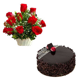 Yummy Delicious Round shape Chocolate cake -1kg + Beautiful Flower basket with 12 Red Roses and Fillers