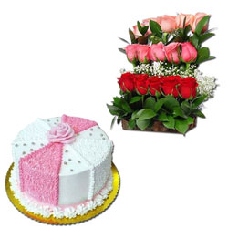Beautiful flower bouquet with 12 Red and 8 pink Roses along with fillers + Designer Round Shape Butterscotch Cake - 1.5k...