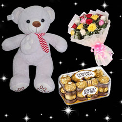 Teddy Bear Cream BST-9108-001 Height:50 cm + Ferrero Rocher 16 pieces Chocolate box + 15 mixed Roses flower bouquet alon...
