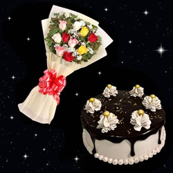 Delicious Round shape Chocolate cake -1kg + 10 mixed roses flower bouquet along with fillers wrapped in a 2 layers white...