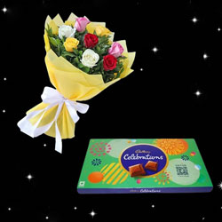 Beautiful Flower Bouquet with 15 Mixed Roses wrapped in a decorative paper with bow. + Cadbury Celebrations Chocolates -...